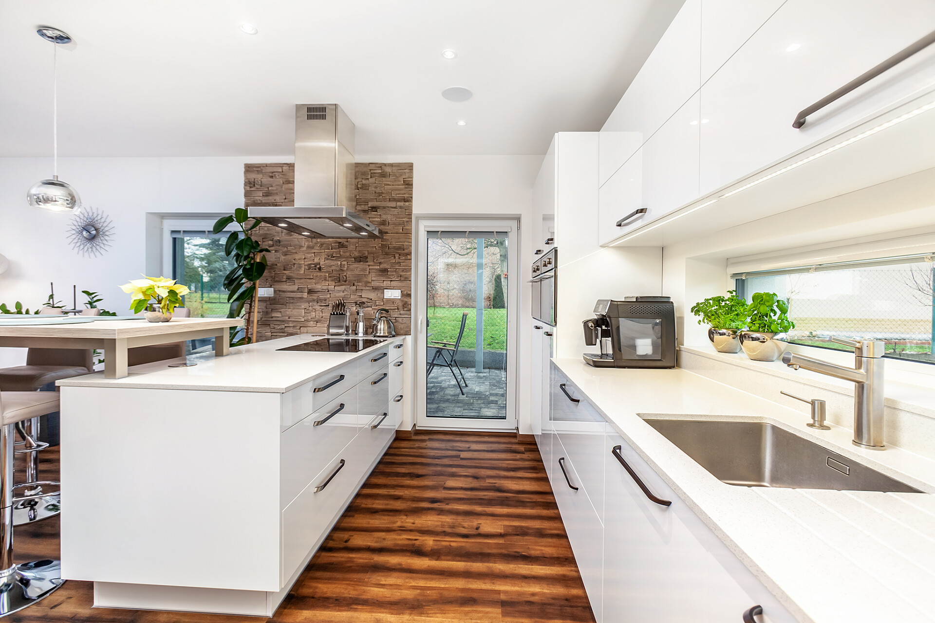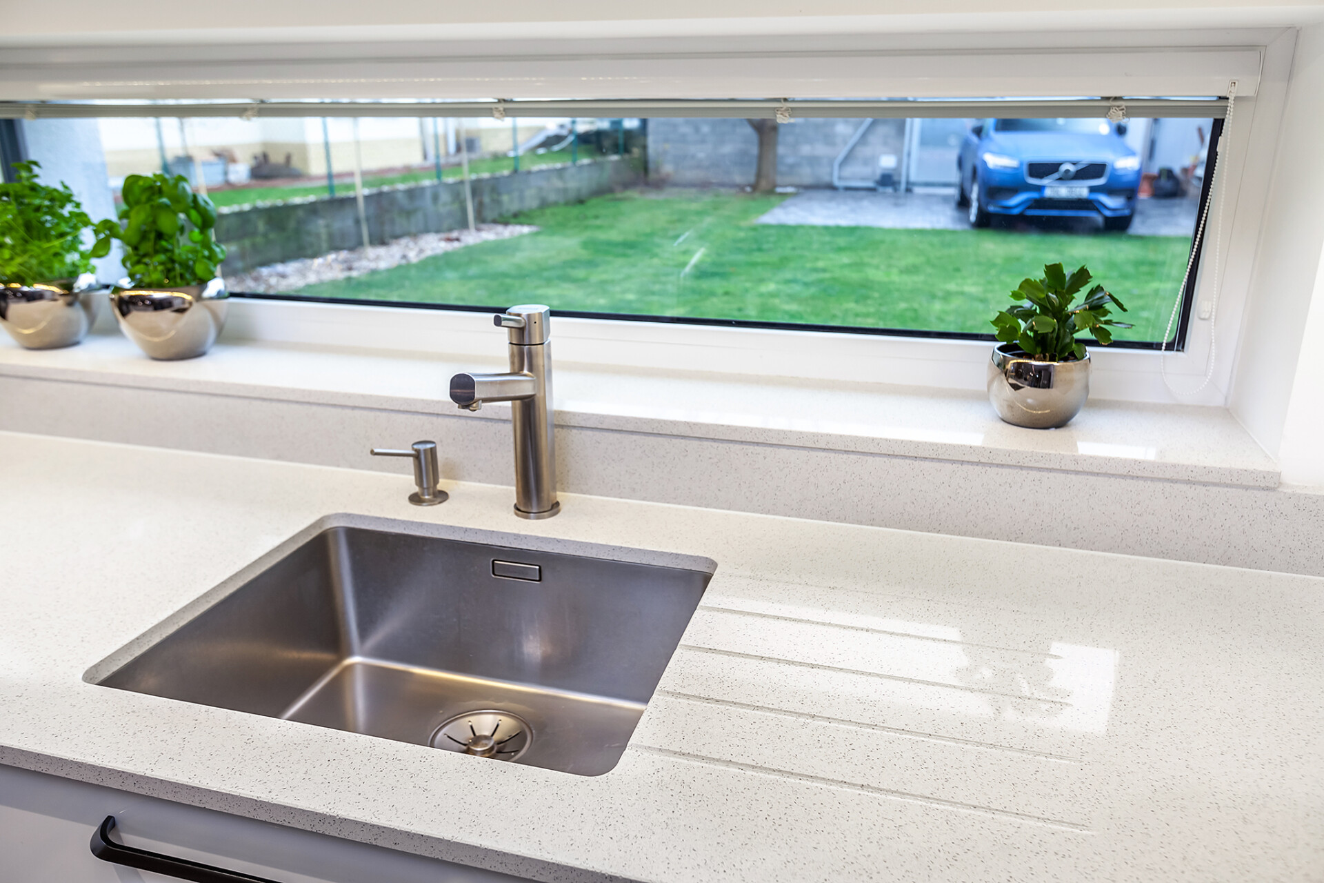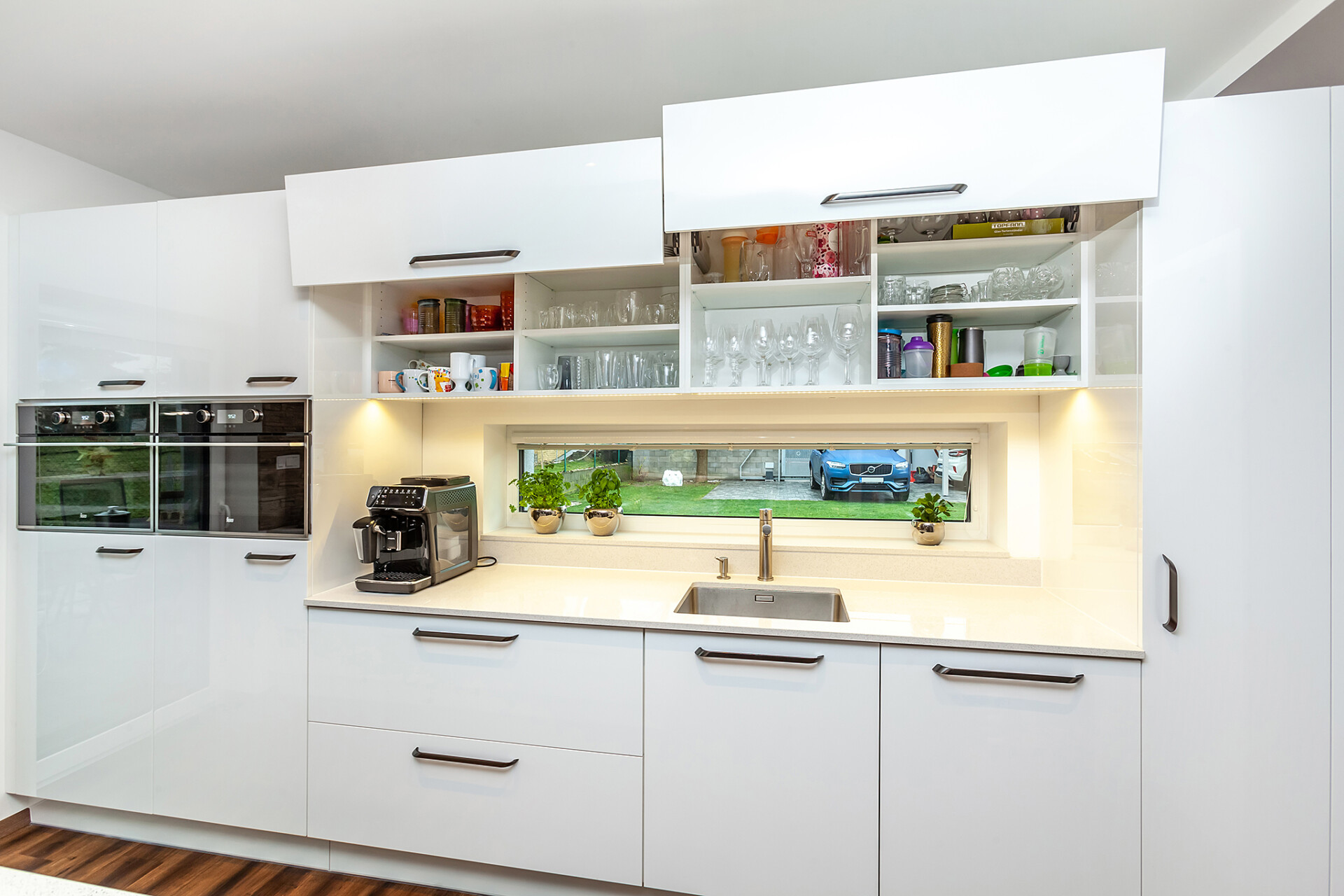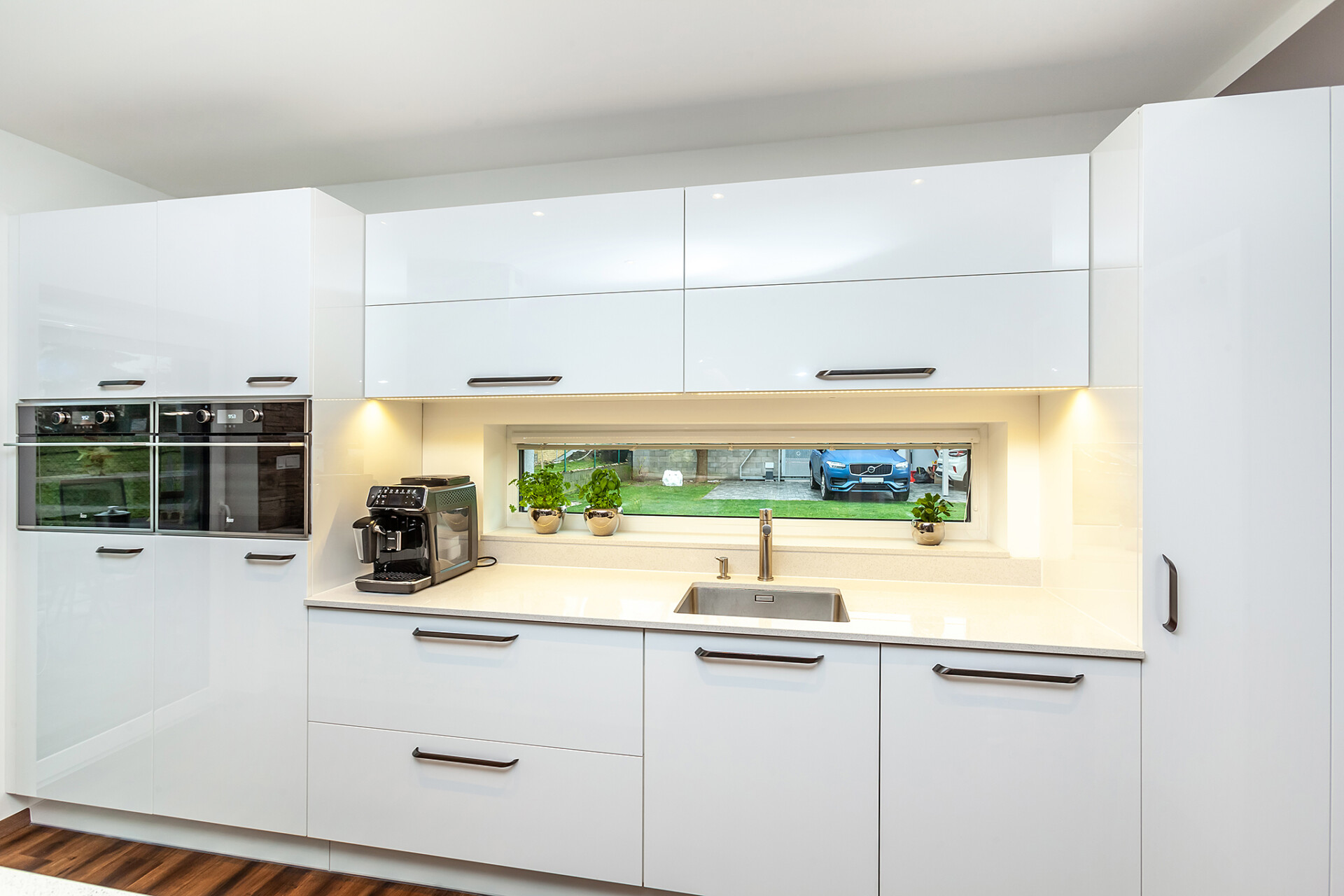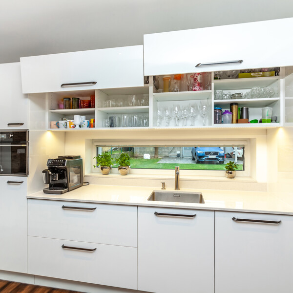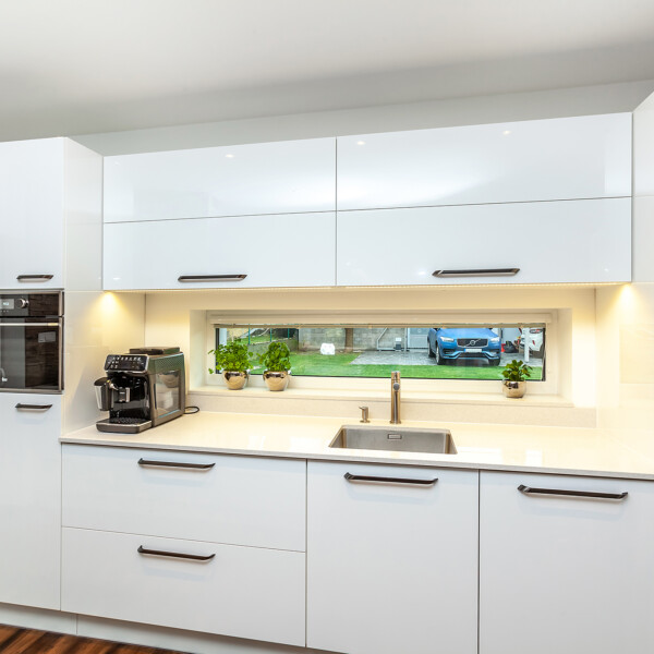 Bílá lesklá kuchyň s pracovní deskou Technistone