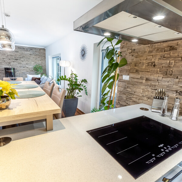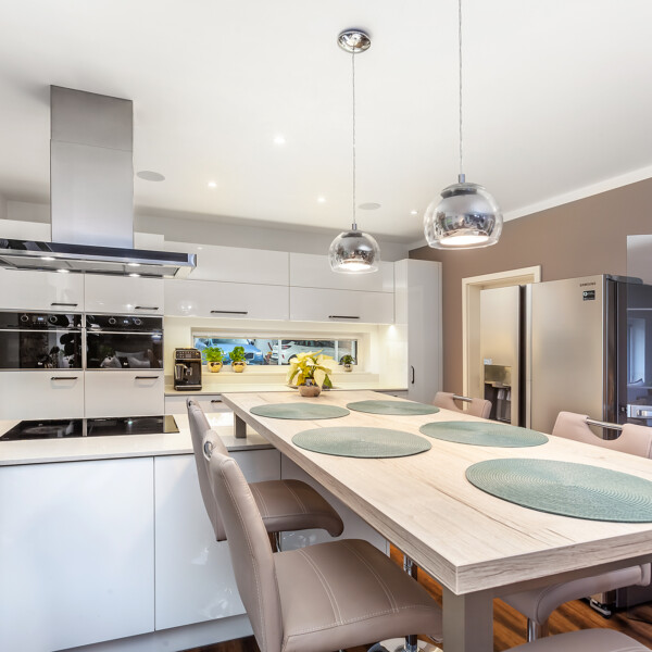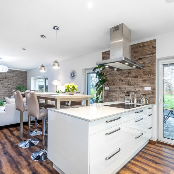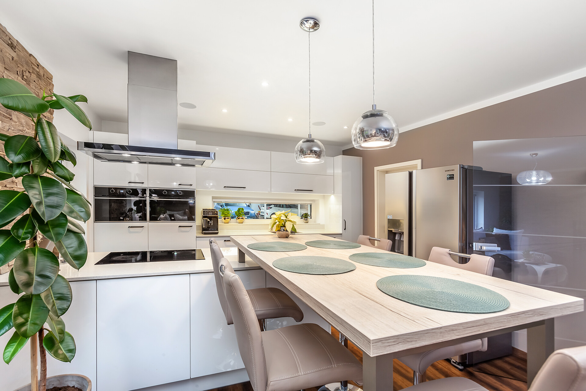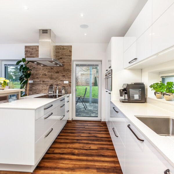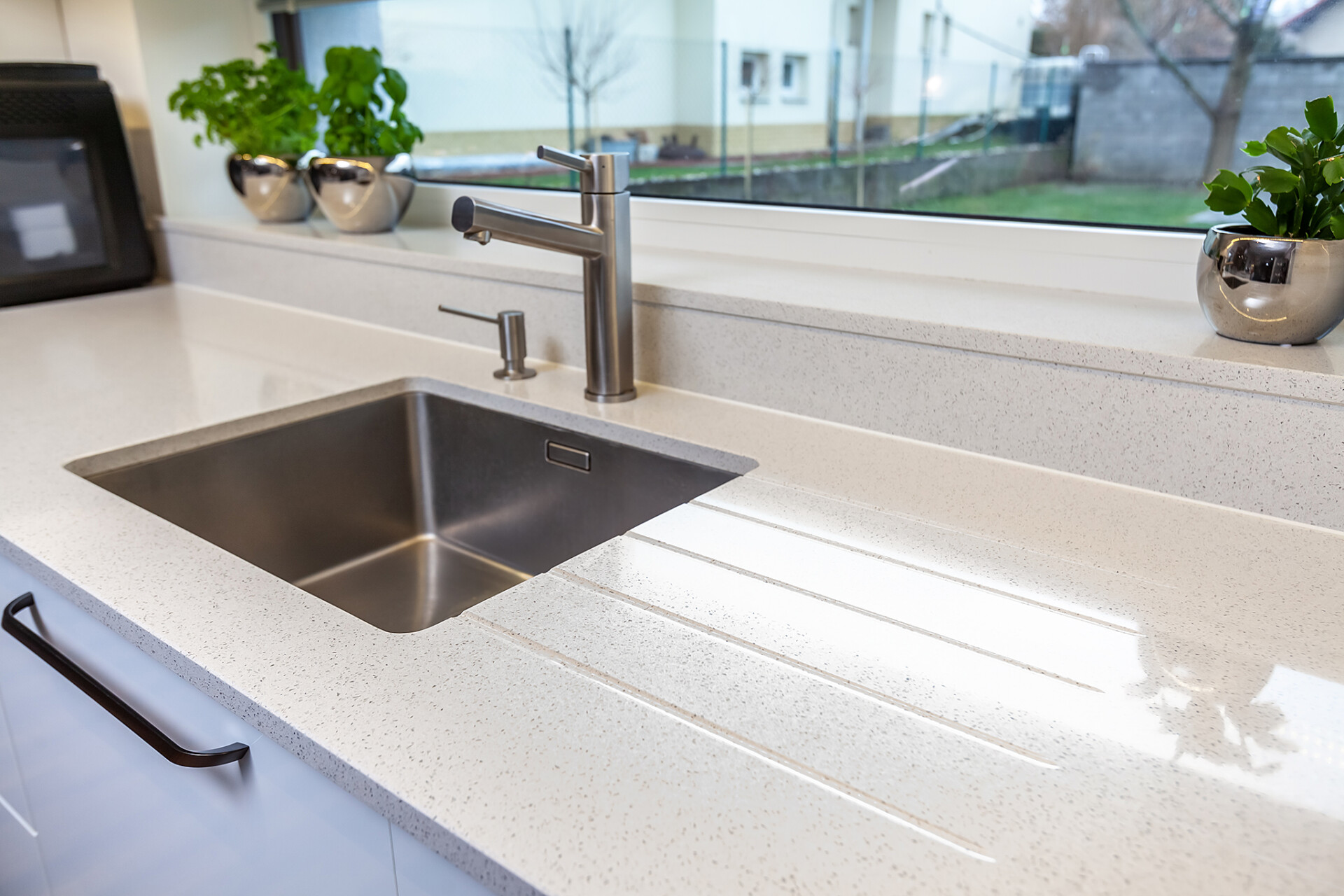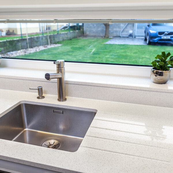 Bílá lesklá kuchyň s pracovní deskou Technistone