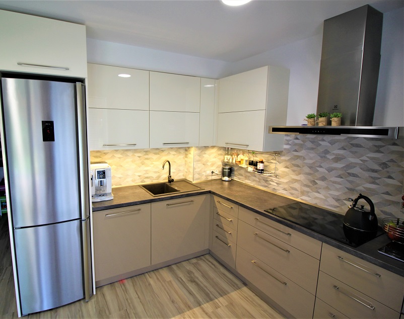 Bílá lesklá kuchyň s americkou lednicí