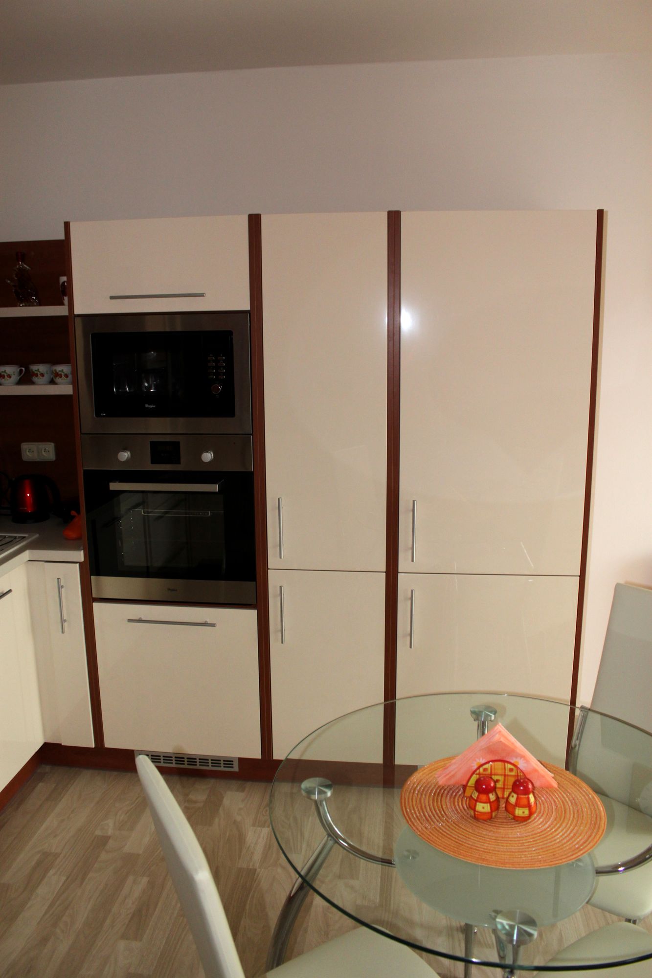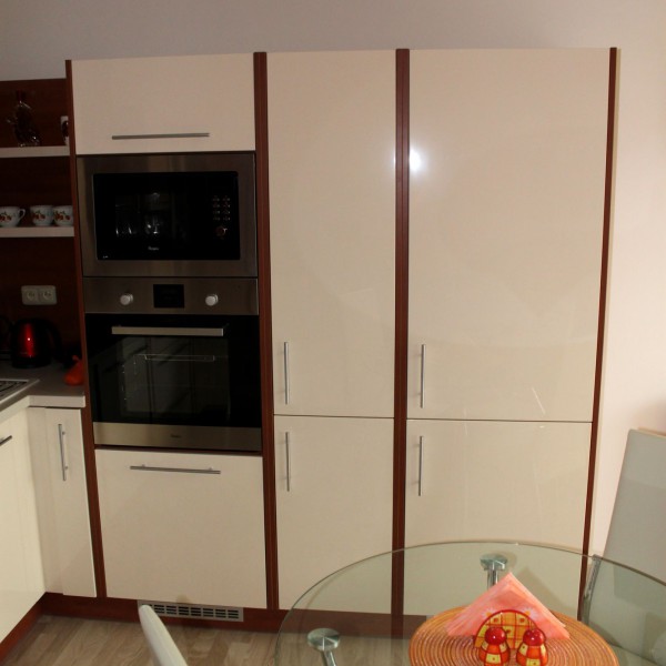 Bílá lesklá kuchyň s americkou lednicí