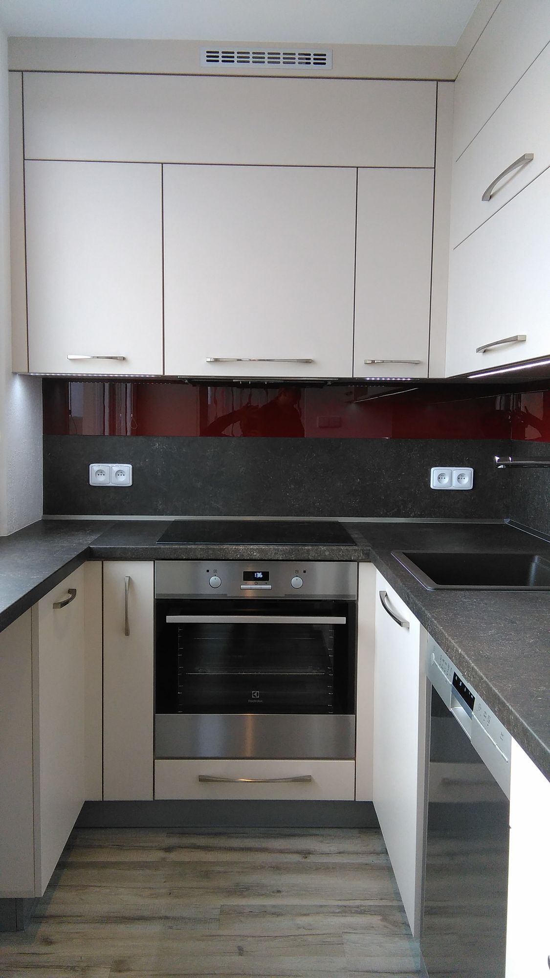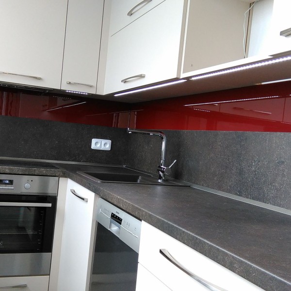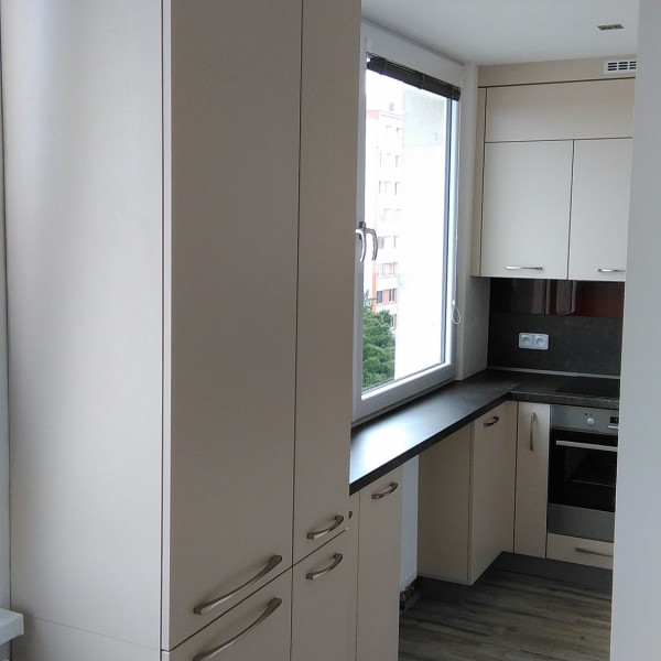 Bílá lesklá kuchyň s americkou lednicí