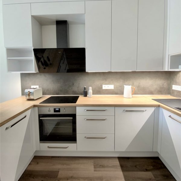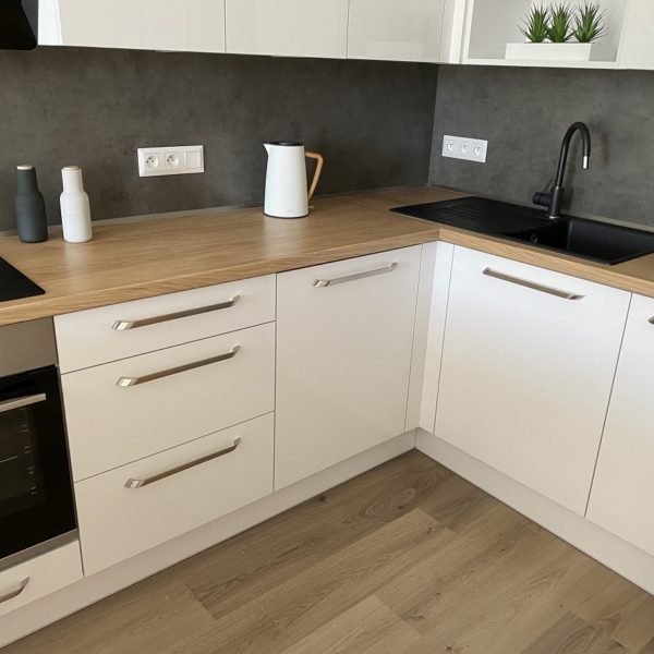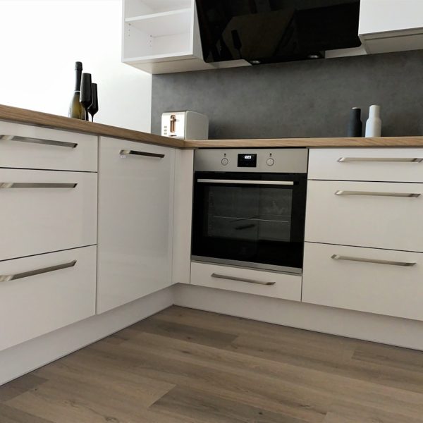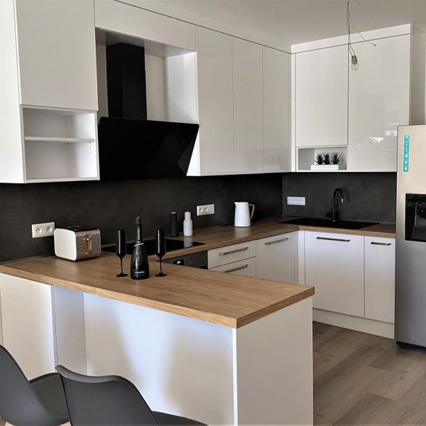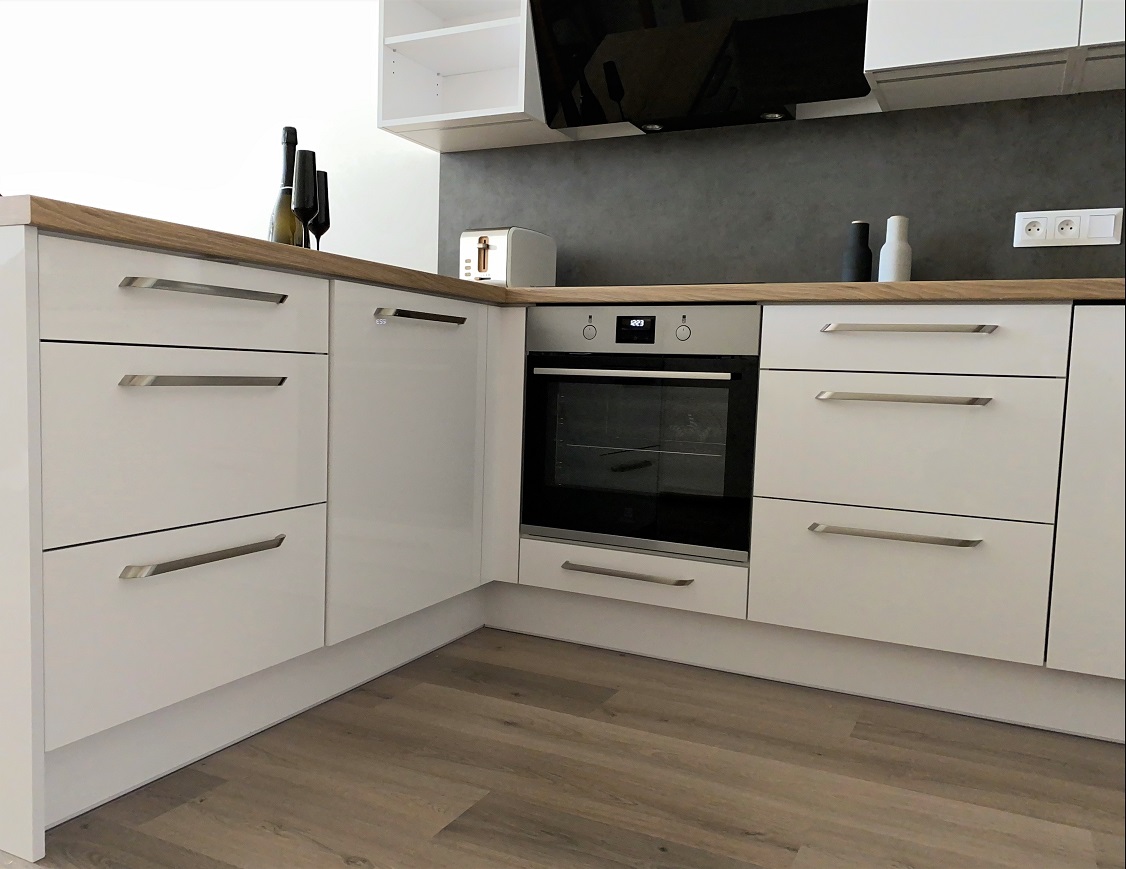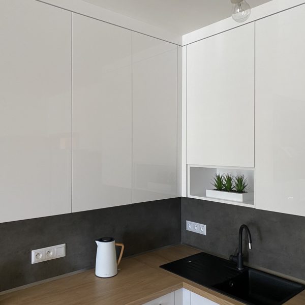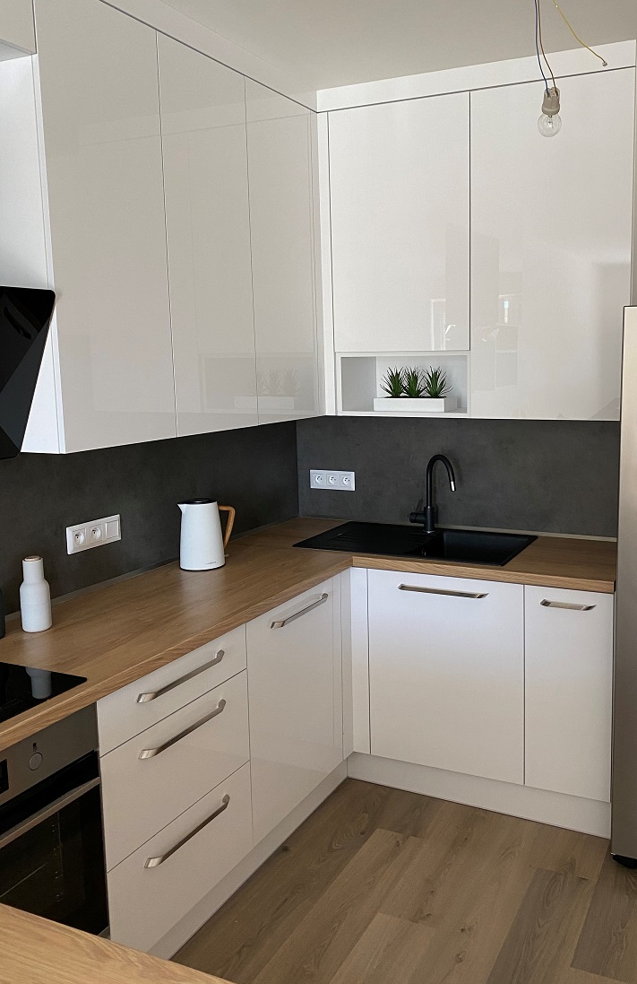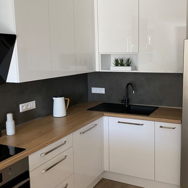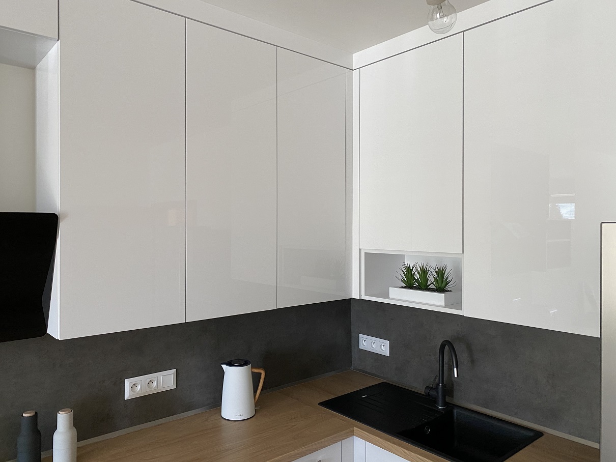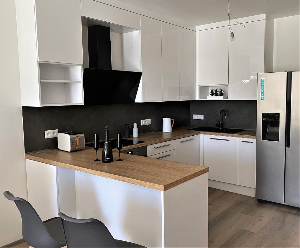 Bílá lesklá kuchyň s americkou lednicí